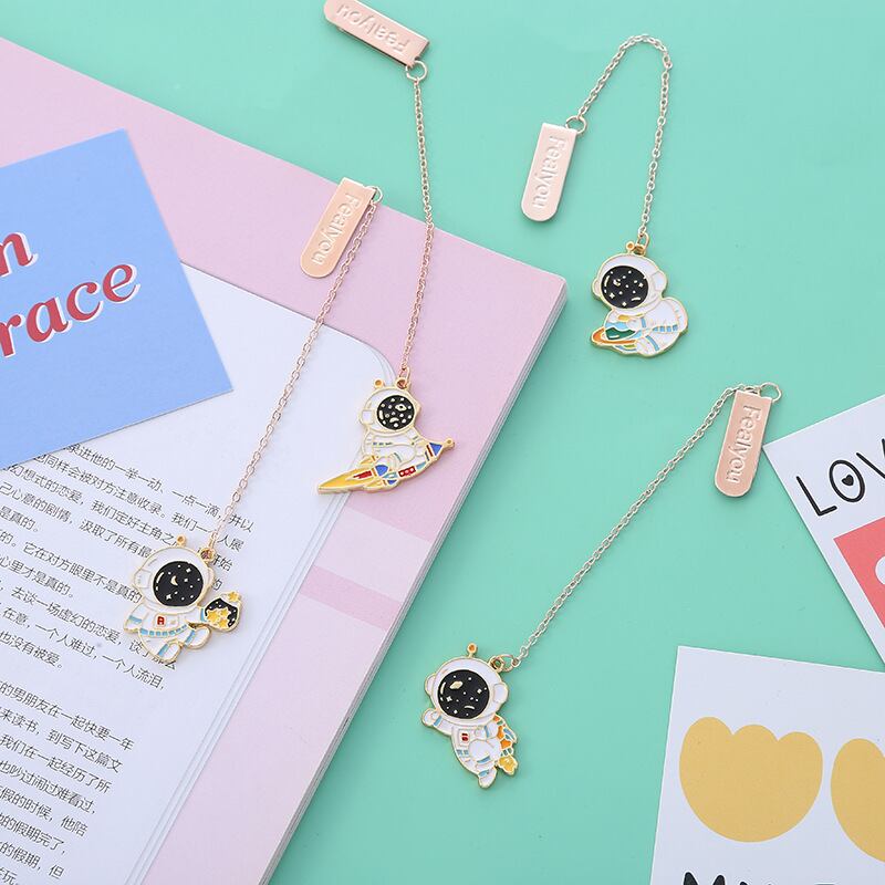 商品名:ブックマーク クリップタイプ 宇宙モチーフ チェーン付きしおり 宇宙飛行士 ロケットデザイン おしゃれ文房具 ステーショナリー