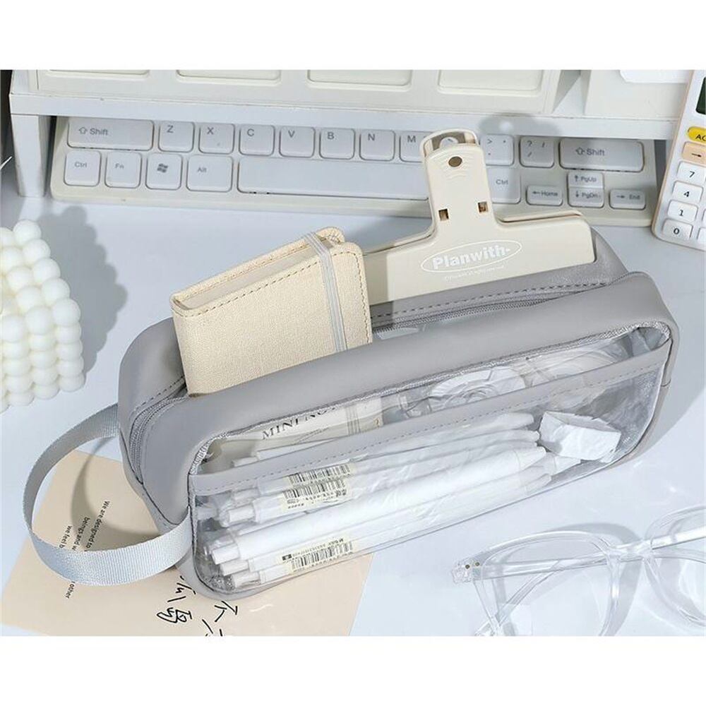 クリアペンケース 大容量 透明ポーチ ファスナー付き スクエア型 無地 グレー シンプルデザイン 学生・メンズ・レディース兼用 文房具収納ni10000a407