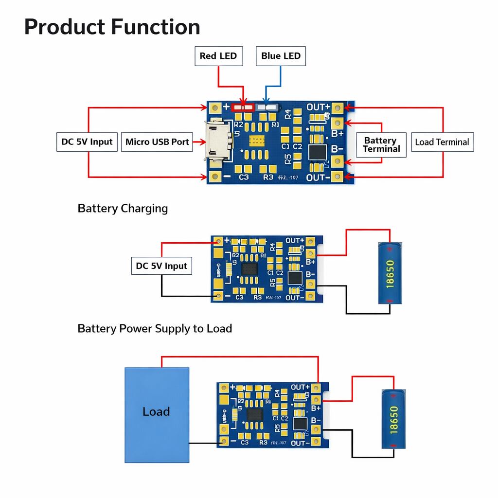 公称電圧 3.6V / 3.7V の18650リチウムイオン電池などの充電および保護回路として使用できます。