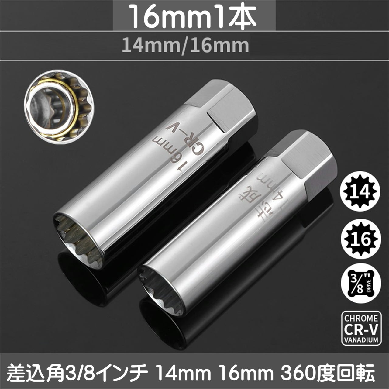 スパークプラグレンチ 磁気ユニバーサルジョイント 差込角3/8インチ 16mm 360度回転 ユニバーサルソケット